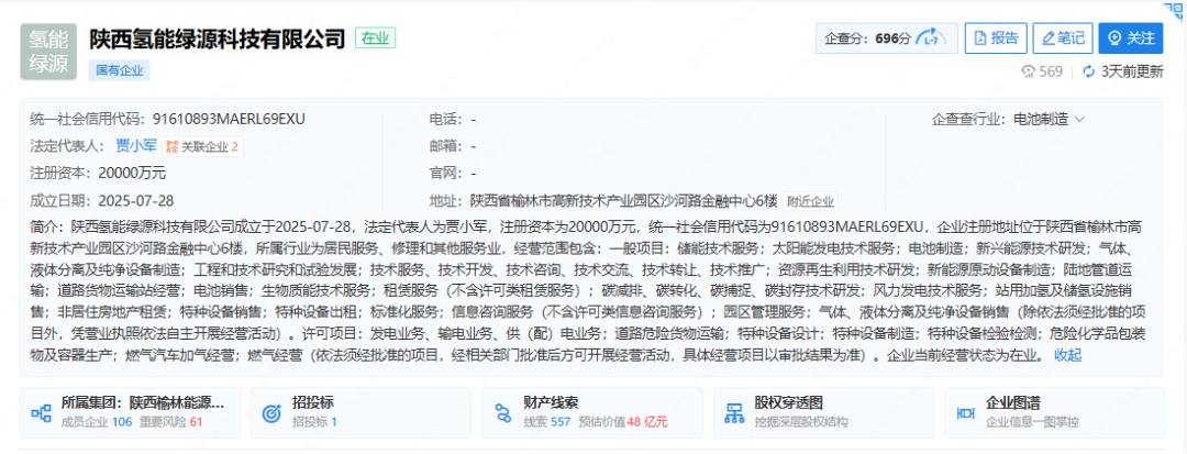 2025年7月28日,陕西氢能绿源科技有限公司成立,注册资本20000万元,经营范围包括一般项目:储能技术服务;太阳能发电技术服务;电池制造;新兴能源技术研发;新能源原动设备制造;陆地管道运输;碳减排、碳转化、碳捕捉、碳封存技术研发;风力发电技术服务;站用加氢及储氢设施销售等。该公司由陕西氢能产业发展有限公司(简称“陕西氢能”)100%持股。据了解,陕西氢能成立于2022年12月31日,是陕西省国资委直接管理的国有能源企业,