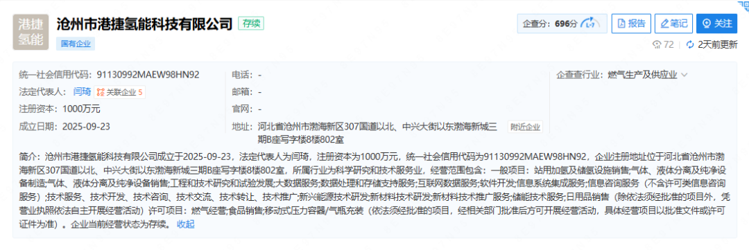 2025年9月23日,沧州市港捷氢能科技有限公司成立,注册资本1000万,经营范围包含:一般项目:站用加氢及储氢设施销售;气体、液体分离及纯净设备制造;气体、液体分离及纯净设备销售;工程和技术研究和试验发展;大数据服务;数据处理和存储支持服务;互联网数据服务;软件开发;信息系统集成服务;信息咨询服务(不含许可类信息咨询服务);技术服务、技术开发、技术咨询、技术交流、技术转让、技术推广;新兴能源技术研发;新材料技术研发;新材料技术推广服务;储能技术服务等。该公司由沧州交发捷铄新能源发展有限公司持股51%,荣程港联氢能科技(沧州)有限公司持股49%。