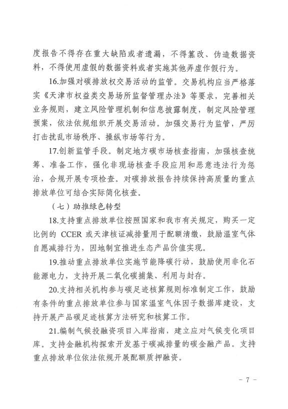 文件指出,在扩大覆盖范围、完善市场调节机制、创新监管手段、健 康有序发展碳金融等方面继续积极探索,到2030年,天津碳市场覆盖范围有序扩大,政策体系进一步完善,参与主体、交易品种更加丰富多元,碳排放数据管理持续加强,助推重点领域绿色转型的作用更加显著。