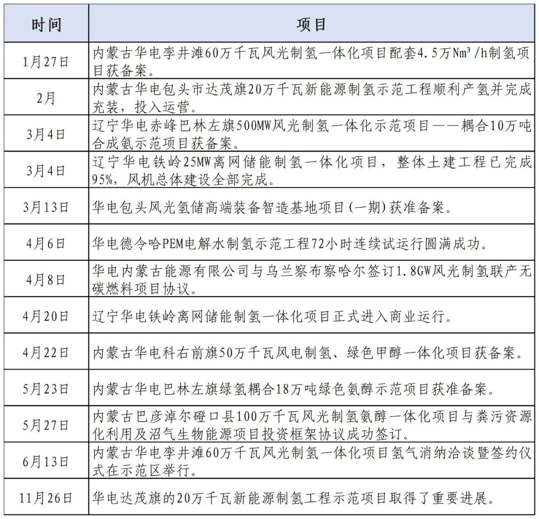 2024年以来,为践行绿色低碳转型规划,中国华电显著加快了氢能步伐,一方面在绿氢项目上接连取得突破,另一方面自研电解水制氢装备在市场逐渐占得“一席之地”,部分项目动态详情如下:
