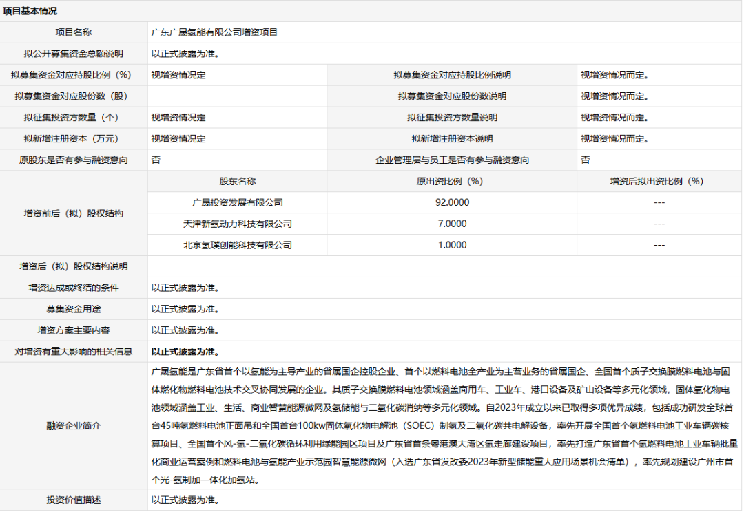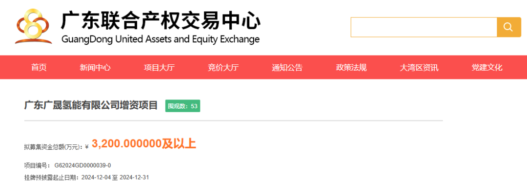 12月4日,广东联合产权交易中心发布广东广晟氢能有限公司增资项目,拟募集资金总额3200万元以上。