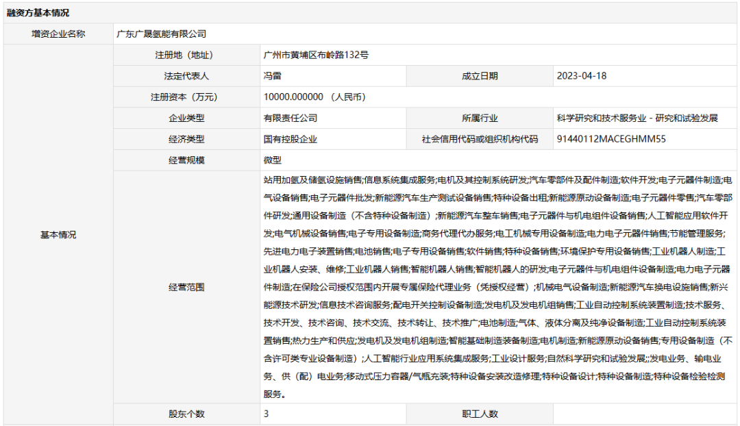 据资料显示,广晟氢能是广东省首个以氢能为主导产业的省属国企控股企业、首个以燃料电池全产业为主营业务的省属国企、全国首个质子交换膜燃料电池与固体燃化物燃料电池技术交叉协同发展的企业。 广东广晟氢能有限公司成立于2023年4月18日,经营范围包括:站用加氢及储氢设施销售;信息系统集成服务;电机及其控制系统研发;汽车零部件及配件制造;软件开发;电子元器件制造;电气设备销售;电子元器件批发;新能源汽车生产测试设备销售;特种设备出租;新能源原动设备制造;电子元器件零售;汽车零部件研发;通用设备制造(不含特种设备制造);新能源汽车整车销售;电子元器件与机电组件设备销售等。